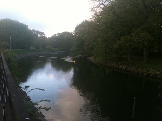 | Mycket fin morgon i Malmö kanal strax före kl 6. Morten Salomonsen paddlar in mot klubben, han har nu paddlat hela 34 varv. Han är nöjd med prestation och klar. |